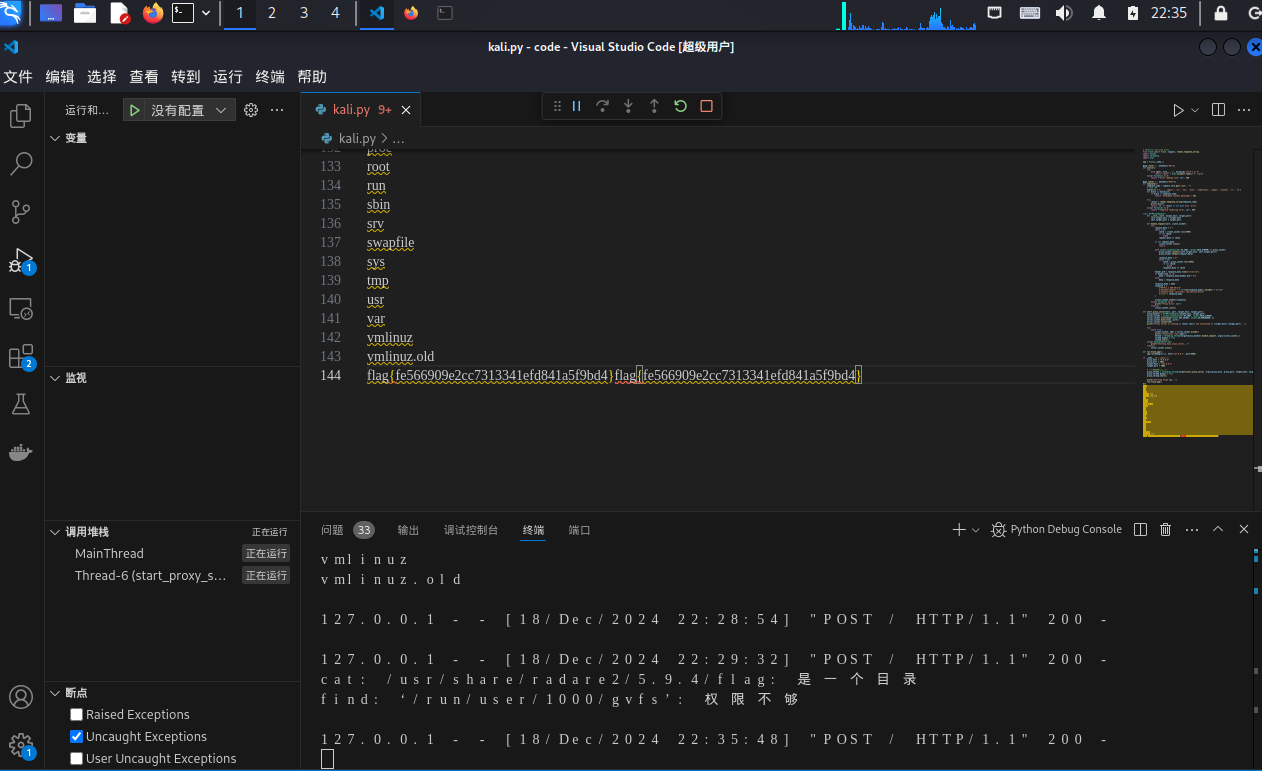 复现的时候在本机上搭建了环境,用用hackerbar执行后看终端返回无法识别cat命令,就很抑或,后面知道了真的给自己蠢笑了,windows根本没有cat命令,然后去搜了windows的相关命令emm。。还是没搞出来。然后就去kali搭建了环境,直接执行上面的payload发现读不到flag,那就先ls /看看。